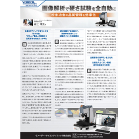 Vader Scientific Co., Ltd. handles research sample crushing and grinding machines, particle distribution/particle shape measurement devices, sieve shakers, electric furnaces, and provides consulting from the preparation of powder samples. This document features an interview with our President, Hiroshi Takatsuji. We are currently offering this document for free. Please make use of it to enhance the efficiency of quality control in powder metallurgy. [Contents] ■ Powder metallurgy is booming with metal 3D printers. Enhancing and streamlining quality control from both "materials" and "products" ■ Fully automating hardness testing. Automatically calculating test points using image analysis technology ■ Supporting the efficiency and labor-saving of quality control. Achieving productivity improvement, cost reduction, and high added value *For more details, please refer to the PDF document or feel free to contact us.