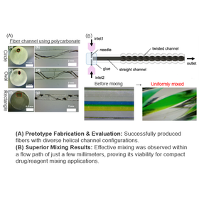 Conventional microfluidic devices are typically manufactured on flat substrates using lithography—a standard semiconductor fabrication technique. However, this traditional approach is largely limited to two-dimensional (planar) channel structures, making it difficult to create complex, three-dimensional fluid paths. To overcome these limitations, the inventors developed a Rotary Thermal Drawing System. This breakthrough device enables the production of hollow spiral microfibers with complex 3D structures. By leveraging this technology, the inventors have successfully designed a highly efficient Micromixer that uses internal helical channels to achieve uniform mixing of fluids, such as chemicals and reagents. Key Technical Advantages: ・Flexible design is possible: the fiber material (e.g. high‑strength material, elastic materials), diameter size, pitch, shape (liner or spiral), hollow or not, etc. ・Portable size of the equipment: Saving space and easy to handle.