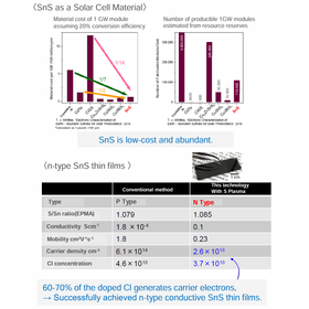 Thin-film solar cells using SnS (tin sulfide) offer the following advantages: ・Free of toxic elements such as Cd and Te. ・Composed of abundant and inexpensive elements (Sn and S). ・Efficient light absorption at a thickness of just 2–3 μm (compared to ~500 μm for silicon). ・A conversion efficiency of 25.3% has been reported for homo p-n junctions. However, achieving high-efficiency SnS solar cells with a homo p-n junction requires n-type SnS thin films, which have been technically challenging to fabricate. In this invention, inventor successfully synthesized n-type SnS thin films for the first time using a novel sulfurization technique based on sulfur plasma. This breakthrough is expected to enable the realization of homojunction SnS solar cells in the future.