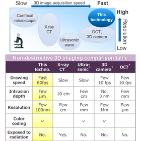 Various 3D imaging methods including X-ray CT, ultrasonography,and confocal laser scanning microscopy are employed in industrial applications, depending on its usage. However, X-ray CT requires the rotation of a light source or the irradiation area to acquire 3D images, which makes rapid imaging difficult. Ultrasonographyenables 3D measurement using 2D array elements but suffers from limited spatial resolution. In addition, confocal laser scanning microscopy requires the sequential acquisition of 2D images while moving the observation plane, which makes 3D observation at video rate impossible. In recent years, 3D cameras and OCT are known as emerging 3D image acquisition techniques. However, the camera-based technique exploiting patterned- or line-illuminations provides limited spatial resolution, and it cannot visualize the internal information of samples. Besides, OCT is, in principle, applicable to reflected light signals only and impossible to measure fluorescence signals.A series of inventions solves the above issues and provides an imaging method with a simple implementation that enables the acquisition of precise 3D images in real-time.