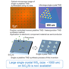 Transition metal dichalcogenide (hereinafter “TMD”) is an atomic material layer with thickness of an atom, which has a bandgap in the visible range and behaves as a semiconductor. The conventional synthesis method is the chemical vapor deposition (CVD) where TMD is synthesized at random position on the circuit board. The position control of the synthesis is essential in order to apply TMD on different devices but the conventional synthesis method doesn’t allow that. The synthesis method with controlled position is also proposed but a polycrystalline TMD is synthesized and it is not convenient to apply to different devices. This invention solves above issues and can provide a synthesis method of monocrystalline TMD or heterojunction TMD by controlling its position using micro dots as a growing core while limiting the size dispersion.