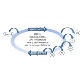 For Japan, where the natural resources are poor, the technology to collect and reuse rare metal is extremely important. In particular, with the increasing demand for electric vehicle, the collection of rare metal from the cathode material of lithium-ion battery has become a major industrial issue. Currently, the collection is done by extracting each metal species with various solvents. However, this method requires the waste liquid treatment of various acid solutions generated during the collecting process. This invention is about a rare metal collecting method using a single organic solvent. The most important feature of this rare metal collecting method is that the waste liquid treatment issue does not occur since it does not generate any acid solutions, so it realizes a rare metal collecting process with low environmental load. The right figure shows an example of the collecting device of this invention. The acetylacetone vapor reacts with waste containing rare metal to become an organometallic gas. The organometallic gas enters into the separator then it is collected by metal species using the difference in boiling point. The recovered organic metal is recycled in the form of metal or metal compound through reactions such as hydrogen reduction, hydrolysis and carbonation. In the mentioned reaction, acetylacetone is necessarily obtained after the reaction, allowing the solvent to recycle. Currently, 80% of the metal can be collected between the separator and the collector.