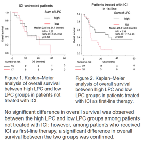 Immune checkpoint inhibitors (ICIs) offer lasting treatment efficacy and improved survival for cancer patients, but positive responses are limited to select individuals and treatment costs are high, highlighting the need to predict benefit before therapy. Current predictive methods like PD-L1 testing mainly measure local tumor tissue expression and fail to fully assess systemic immunity. Researchers examined blood lysophosphatidylcholine (LPC) levels and clinical outcomes after ICI therapy in squamous cell carcinoma patients. They found that those with higher LPC had significantly prolonged survival post-ICI compared to those with lower levels. Because LPC is measurable in blood samples, it reflects systemic immune status and reduces patient burden by eliminating biopsies. This finding supports developing new clinical tests for predicting ICI effectiveness.