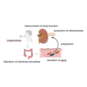 Chronic kidney disease (CKD) is a major global health issue without any drugs that improve kidney function. Previous mouse experiments showed that lubiprostone, a constipation drug, reduces uremic toxin accumulation by improving the intestinal environment altered by kidney decline, thus inhibiting kidney damage progression 1. A phase II clinical trial was conducted to test lubiprostone's effects on kidney function in patients. Results revealed dose-dependent suppression of kidney function decline (eGFR) in lubiprostone-treated patients compared to placebo. Further analysis showed lubiprostone improves kidney mitochondrial function by modulating the gut microbiota and increasing spermidine production, which enhances mitochondrial activity and provides kidney protection.
