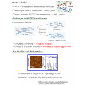 Single-walled carbon nanotubes (SWCNTs) are regarded as promising materials for next-generation electronics owing to their unique optical, electronic, and mechanical properties. Conventional synthesis methods such as laser ablation and arc discharge create SWCNTs with a broad mixture of chiralities, resulting in inconsistent device performance. Polymer wrapping and density gradient ultracentrifugation (DGU) are widely used for chirality separation, but polymer wrapping is limited to certain chiralities and DGU tends to shorten nanotube length, increasing resistance in electronic devices. We have developed a new dispersion and purification method that enables efficient separation of a wide variety of SWCNT chiralities—including enantiomers—while preserving tube length. The resulting high-purity, long SWCNTs allow the realization of advanced devices with high speed and sensitivity, expanding the possibilities for practical applications in electronics and sensing technologies.