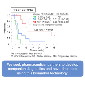 For patients with platinum-sensitive recurrent or metastatic head and neck squamous cell carcinoma (HNSCC), first-line therapy usually involves pembrolizumab (an immune checkpoint inhibitor; ICI) with chemotherapy (5-FU plus cisplatin/carboplatin), or pembrolizumab alone for PD-L1–positive cases defined by the combined positive score (CPS). As a second-line option, cetuximab (anti-EGFR antibody) plus paclitaxel (CET+PTX) is commonly used. Our study revealed a mutually exclusive correlation between responses to first-line pembrolizumab and second-line CET+PTX. Comprehensive gene expression analyses identified key biomarkers linked to this correlation. This diagnostic approach allows prediction of each therapy’s efficacy in individual patients by measuring these biomarkers.
