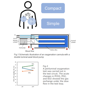 Patients with severe respiratory failure or low oxygen saturation are currently supported by ECMO, but conventional systems are bulky, highly invasive, and require specialized expertise. This system integrates a miniature axial-flow blood pump and a hollow-fiber oxygenation unit within a dual-lumen cannula, allowing blood pumping, oxygenation, and CO₂ removal in a single device. ・ Integrated pump and oxygenator: No additional artificial lung needed ・ Single-port percutaneous insertion: Femoral or jugular access reaching the right atrium ・ Recirculation control: Flow rate and oxygenation optimized via pump speed ・ Low-flow gas exchange proven: Effective oxygenation and CO₂ removal demonstrated at 0.2 mL/min