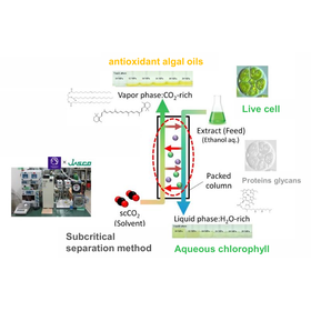 The inventors have developed a subcritical separation technology, which, combined with a newly established method for estimating phase equilibria in a carbon dioxide–ethanol–water ternary solvent system near room temperature, enables the design of efficient extraction conditions for algal oils. This invention proposes a clean extraction technology that mixes subcritical fluids with a feed solution (alcohol–water solution containing algae) to separate a vapor phase enriched in oils and a liquid phase enriched in chlorophyll and pheophorbide. ◎ Enhanced Safety ◎ Suppression of Oxidation and Thermal Degradation ◎ Energy Savings ◎ Low Environmental Impact