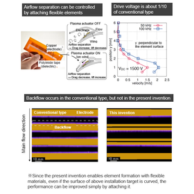 Plasma actuator is an element that generates airflow using the electric current force generated by the electrical discharge. It is attracting attention as the next generation of airflow control device because it can actively control the flow with a simple configuration that does not use moving parts. However, the conventional plasma actuator needs a large quantity of high-voltage power supply because it requires a drive voltage of over 10000V. The development of multi-electrode plasma actuator with multiple elements lined up for low-voltage drive has been done, but it has not yet been put to a real practical use due to a number of issues, such as arc discharge between multiple electrodes and interference between electrodes that causes electric current force in the opposite direction of the main flow, which reduces performance. This invention is about a multi-electrode plasma actuator that can prevent arc discharge between electrodes and that do not generate backflow. Unlike conventional method, it is possible to reduce the driving voltage of the plasma actuator to a few hundred volts in principle because the performance is improved by increasing the number of electrodes.