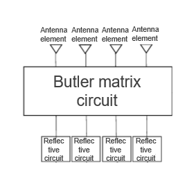 In backscatter communication such as radar or radio frequency identifier (RFID) system, the received power decreases with the communication distance. To extend the communication range, it is necessary to increase the radar cross section of the target in the case of radar, and to increase the tag antenna gain in the case of RFID system. However, in both cases, it is not easy to reflect radio wave toward the arrival direction because the target to reflect radar signal and the arrival direction of the signal to reflect are not known. This invention is able to reflect radio wave in the direction in which the incident radio wave arrives by using a small radio wave reflector. This invention has an antenna element, a reflective circuit and a butler matrix circuit. When the reflection circuit receives an incident radio wave input from the antenna element via the butler matrix circuit, it sends out a reflected radio wave in the direction in which the incident radio wave arrived via the butler matrix circuit and antenna element. This small radio wave reflector allows radio wave to reflect in the direction in which the incident radio wave arrived.