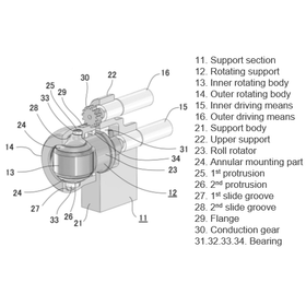 Conventionally, drive mechanism such as conical gear has been developed for robot arm joint to enable driving in multiple directions with a single joint. The joint of the robot arm can be made smaller and more sophisticated by using such driving device. However, since the gear is used to convert the rotation direction, backlash is generated and causes output error. Moreover, the smaller the size, the more difficult it becomes to transmit a large amount of torque. This invention is able to reduce backlash and increase output precision, and to provide a 2 directional driving device that can transmit a relatively large amount of torque even when downsized. This invention is composed of a support, a rotating support, and a plurality of protruding parts, wherein the extremity of each protruding part is configured to rotate the inner rotating body by the sliding movement. This structure reduces backlash, improves output precision, and provides a 2 directional driving device that can transmit a relatively large amount of torque even when downsized.