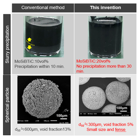 Particles with a uniform size of few 10 to 100 ㎛ are expected to be used as raw material for additive manufacturing (3D printer). The Pulsated Orifice Ejection Method (POEM) and the freeze-dry POEM (FD-POEM) developed by the inventor are used for their production. From the point of view of composition control and spheronization by surface tension, the raw material is preferable to be in slurry form. However, the precipitation in a short time and consequently high particle concentration cannot be achieved. This invention makes possible to disperse particle for a relatively long time at a high concentration and to produce small & dense spherical particle than the conventional one using FD-POEM. Moreover, this invention can be applied to particle production of MoSiBTiC alloy, which is an ultra-high temperature material.