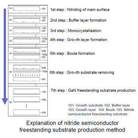 Recently, III-nitride semiconductors (GaN and InGaN) have been attracting attention as semiconductor materials for light-emitting devices such as LED and lasers. This nitride semiconductor has a bandgap energy with wide range wavelengths from infrared to ultraviolet light, and it is a promising material for blue & green LED and semiconductor lasers with UV to infrared region emission wavelengths. However, in the case of nitride semiconductors, the equilibrium vapor pressure between the gas and solid phases of nitrogen is much higher than the conventional III-V materials, so it is not possible to fabricate GaN single crystal substrates at low cost. Another option is to use freestanding GaN substrates, but the current fabrication techniques are costly. This invention is able to fabricate nitride semiconductor freestanding substrates with low threading dislocation density at a low cost. This invention comprises a total of seven steps, from the process of forming a buffer layer having a nitride semiconductor on the growing substrate main surface, to the process of fabricating a plurality of nitride semiconductor freestanding substrates.