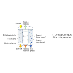 For CO2 fixation and usage, there are many systems that involve mass transfer, reaction and absorption between gas / liquid; for example the reaction of an amine absorption solution or calcium solution with a dilute CO2containing gas. The conventional spray, bubble, packed and wetted wall columns are increasing in size in order to increase the reaction interfacial area and detention time. For the concentration, crystallization and drying in the salt manufacturing process in Japan, the conventional shaft kiln method has the same issue of the equipment size increase. The high energy consumption is also an issue since the bubbles are generated by boiling the liquid phase. This invention achieves the equipment downsizing by increasing the gas-liquid reaction field area by using the phenomenon that the gas phase introduced into the heat exchange mechanism using a rotary double tube is refined and retained in the solvent by the agitation and shearing force of the rotating cylinder. The heat transfer rate is improved and the energy saving is possible thanks to the removal of precipitate and boundary film on the rotating cylinder.
