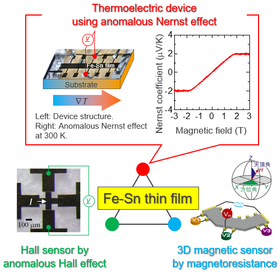 Magnetic field sensors are used in a variety of applications such as contactless current detection and electronic compasses, etc. Because an ordinary magnetic element detects only magnetic field components in a specific direction, detecting the direction of a magnetic field vector in 3D space requires a 3D combination of elements corresponding to each direction. This is an issue to device miniaturization and integration, which are rapidly increasing in demand in the IoT field. This technology relates to the invention of a planar magnetic field sensor that does not require a 3D structure. The direction of the magnetic field vector in 3D space is determined from the voltage generated in each part of the ferromagnetic Fe-Sn thin films[1]. A 3D magnetic field sensor can be fabricated by patterning a single magneto-sensitive layer by a general-purpose device processing method. In addition to magnetic field sensors, this thin film can be expected to create new applications by combining functions[2-5].