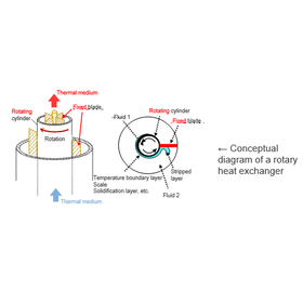 The rotary heat exchanger has a structure in which a fixed blade is in sliding contact with a rotary cylinder. Therefore, the temperature boundary layer (boundary film) of the heat transfer surface on the rotary cylinder is removed, and the fluid inside and outside the rotary cylinder can continuously exchange heat with high efficiency. In addition, even in the system where the solidification layer such as the scale is likely to occur (Hot spring water, polluted water, etc.), the solidification layer is always removed, and stable operation can be realized. In the conventional rotary heat exchanger, since only one side in the axial direction of the rotary cylinder is supported, there is a problem that the gap between the rotary cylinder and the fixed blade is likely to occur due to the run-out of the rotary cylinder, and the boundary film and solid phase are likely to remain. In addition, a rotary heat exchanger with both sides support has been devised, but the difficulty is that the rotating mechanism is immersed in the fluid, so it is unsuitable for the system with solid phase formation. In response to the above problems, the inventors have developed a mechanism (* (2)) in which the rotating mechanism on both sides touches only the clean fluid, and have created an invention that contributes to the practical application of the rotary heat exchanger such as a combination (* (1)) with a latent heat storage material.