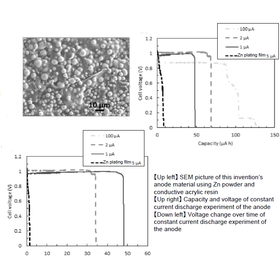 A battery using stomach acid as electrolyte solution has been developed in the recent years. However, the conventional stomach acid battery generates hydrogen at electrolyzation since the standard electrode potential of the anode material, such as zinc, is lower than the standard hydrogen electrode potential. Moreover, the generated hydrogen adsorbs on the anode surface and reduces the battery efficiency such as electric potential or capacity in a short time. This invention can provide a battery and anode able to generate electricity stably for a long time by limiting the hydrogen generation. The anode of this invention contains a conductive polymer, and an anode powder made of metal, alloy or compound in which the standard electrode potential is less important than the standard hydrogen electrode potential. The conventional anode forms hydrogen radicals after electrode reaction but the conductive polymer located around this invention’s anode absorbs the hydrogen radicals and limits hydrogen generation.