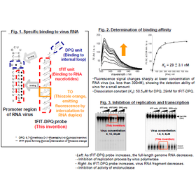 Introduction Influenza prevails broadly every season. Current diagnostic drugs can not be performed until the virus increases quite a lot (ca. 12~24h after infection, symptoms may appear), and if not so, both sensitivity and accuracy of the test will be doubtful. To prevent on-going severe symptoms, new diagnostic tech for influenza at earlier stage becomes so demanded. This invention provides a conjugate of peptide nucleic acid sequence (PNA) and a small molecule, targeting the commonly identical RNA hairpin promoter region of eight kinds of influenza A virus. Effect & Application The conjugate (tFIT-DPQ probe) is composed of two parts: tFIT unit for recognition of virus RNA’s nucleotides and DPQ* unit for UAA internal loop binding. In tFIT unit, a fluorescent ligand is inserted so as to be capable to emit signals when intercalating to RNA duplex (Fig. 1). The conjugate shows an over 1000 times greater binding affinity than DPQ molecule only (Fig. 2). By simply mixing the virus RNA contained sample and the conjugate together, test result will be obtained within a short time (ca. 2~3 min) and 1nM virus RNA (ca. 1010 copies) can be detected. Moreover, the virus inhibition effect by the conjugate in micromolar range was confirmed (Fig. 3). tFIT-DPQ probe is expected to be applied as diagnostic and inhibitory drugs, as well as a screening tool for influenza drug candidates.