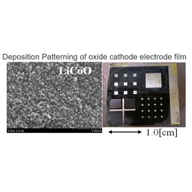 We have developed a technology to deposit solid-state ionic films used in solid oxide secondary batteries at room temperature by electroplating. This technology makes it possible to integrate small solid-state ionic batteries, which has been difficult until now. Some oxide solid-state ionic batteries are fabricated by powder sintering or sputtering, but they require a high temperature process, so the separation by thermal stress is a problem. The present invention provides a technique for depositing a solid ionic film (Cathode electrode and solid electrolyte films) by electroplating without requiring a high temperature process. The films of the cathode active materials and solid electrolytes were successfully deposited and patterned by electroplating at room temperature. In addition, an ionic solid-state battery was fabricated using this technology, and its operation was confirmed (right figure).