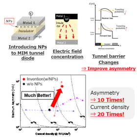 ・Metal/insulator/metal tunnel diodes (MIM tunnel diodes) are used when rectifying signals of frequencies in the infrared and terahertz regions. ・ However, it is difficult to improve the rectification performance because there is a trade-off between electrical resistance and asymmetry. ・ The invention has solved the above issue by introducing metallic nanoparticle layers (NPs) into the MIM tunnel diodes and changing the tunnel barrier at forward and backward biases by the effect of electric field concentration. ・ Since the invention has greatly improved rectifying performance compared to tunnel diodes without NPs,the present tunnel diodes can be expected to be used to high-frequency devices (Optical rectenna, IR, THz detector).