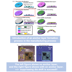 The Fan-out Wafer Level Package (FOWLP) method, which is the mainstream method for semiconductor packages, especially for mobile applications, has a problem of "die shift" in which mounted components shift by flow of sealing resin and wiring defects occurred. Further, even in a device such as a flexible display, there is a problem that a mounted component on the device is shifted when the device is bent. In order to solve the above problems, the invention is a method of manufacturing a semiconductor package without die shift by incorporating a special anchor layer under a mounting component and adopting a special manufacturing process, and the semiconductor package. The invention is expected to produce a highly integrated semiconductor package without a die shift, and to be applied to a flexible display and a wearable device.