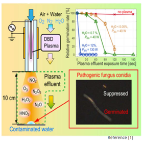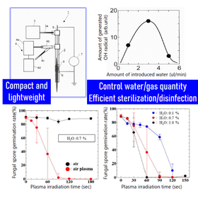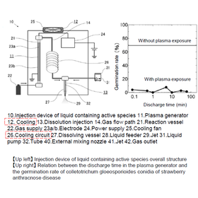 The conventional chemical for sterilization and pest extermination destroys the environment due to its residue. In order to solve this problem, the following technical issues needed to be accomplished. Apply highly bactericidal and environmentally friendly hydroxyl radical (OH radical) for sterilization, disinfection and pest extermination 1、 Establish an efficient method for producing a large quantity of hydroxyl radical 2、 Substitute air for helium and argon expensive gases to reduce cost and weight (ease of transport). The most important characteristic of this invention is the creation of a plasma jet device where the air is used instead of expensive gases such as helium and argon, and introduces a water mist that can produce a large quantity of hydroxyl radicals, which are the most effective for sterilization.