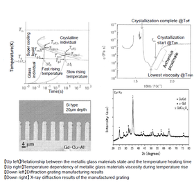 In X-ray and neutron interferometry, the wavefront control elements must be precisely shaped. Grating with high-precision shape is required especially for interferometer where metallic glass grating is used as wavefront control elements. To obtain a metallic glass grating, it is preferable to bring the grating as close as possible to the crystallization initiation temperature with fast heat-up. However, more the temperature is high, more the lifetime time for the supercooled liquid is short. Therefore, the metallic glass material has to be molded while the viscosity is still high. In addition, the conventional grating manufacturing has difficulty to obtain small structures and the process needs long time. This invention is able to form a metallic glass material with low viscosity, and to provide a manufacturing method, wavefront-controlled elements and diffraction grating with structure smaller than few 10μm having precise shape control in a short time. This invention has a process of heating a metallic glass material in a supercooled state to a temperature above the crystallization begins, and mixing until the crystallization is completed.