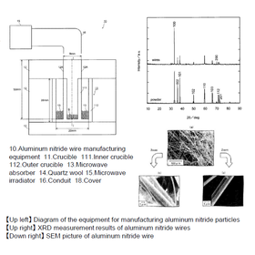 Aluminum nitride (AlN) is known to be used as a filler in the sealing resin of electronic components and semiconductors to efficiently dissipate the heat due to its high insulation and thermal conductivity. AlN particles are manufactured at high temperatures, but the conventional method can not include a large amount of AlN particles in the resin. In recent years, the improvement of sealing resin strength is required since the demands for miniaturization of electronic components and semiconductors are increasing. This invention can simply provide a new form of AlN that can be suitably used as a thermally conductive filler and a high strength filler. This invention is characterized by the process of mixing the carbon and alumina particles in a crucible then to achieve a mixture ratio more important than the stoichiometric mixture ratio required to produce AlN, and irradiating the alumina particles with microwaves under a nitrogen atmosphere to reduce and nitride the alumina particles with carbon particles. This invention describes also the process of sublimating the AlN and attaching it to a sample in a non-heated state to produce an AlN wire.