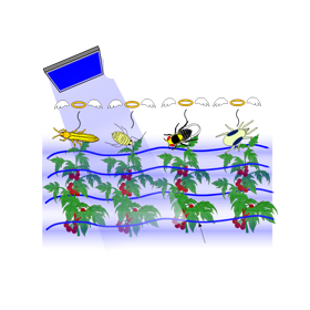 Blue light irradiation has been shown to be effective in killing more than 10 species of pests. Previous studies have used light-emitting diodes, but large facilities have had problems with their light intensity. Therefore, the inventors have developed a device that effectively emits blue laser light as a device that exerts insecticidal effects over a wide area. (Usefulness) ・Safe compared to methods using ultraviolet light to kill insects. ・Suitably designed to kill multiple species and objects at different stages of development. ・At the same time as killing, growth can be promoted by shining a favorable light on plant growth.