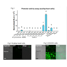 Understanding gene functions in marine invertebrates has been limited, largely due to the lack of suitable assay systems. The inventors discovered a strong viral promoter derived from a bivalve-infectious virus, ostreid herpesvirus-1 (OsHV-1). This promoter showed 24.7-fold and 16.1-fold higher activity than the cytomegalovirus immediate early (CMV IE) promoter and the endogenous EF1α promoter, the two most commonly used promoters in bivalves so far (Fig.1). GFP assays showed that the OsHV-1 promoter is active not only in scallop cells (Fig.2) but also in HEK293 cells (Fig.3) and zebrafish embryos.