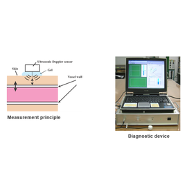 Causes of fatal diseases such as cerebral infarction and myocardial infarction include vessel diseases such as arteriosclerosis, vascular stenosis, or aneurysm. Early non-invasive detection of such vessel diseases can prevent the development of fatal diseases. Conventional PWV tests can only determine vascular stiffness. The present invention is a novel method that combines viscoelastic analysis of blood vessels and irregular vibration analysis of blood vessel walls. It is a noninvasive diagnostic method that can cope with various causes of arteriosclerosis. Aneurysms in the trunk, which are distant from the measurement site, can also be determined. ★The software patent was filed jointly with Rise Corporation, and the software will be manufactured by the company. ★A prototype of the equipment has been completed, and it is available for loan upon request.