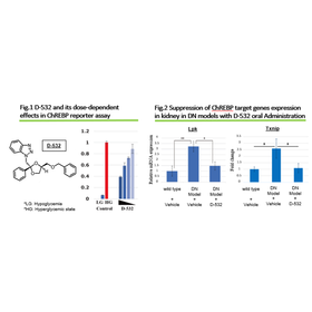 The number of dialysis patients continues to increase, and it is known that applox. 40% of the patients requiring dialysis in Japan were ordinally those with diabetic nephropathy (DN). The treatment for DN is often symptomatic by controling blood sugar and blood pressure, and to date, no effective therapeutic agent for curative treatment has been developed. This invention discloses a 1, 3-dioxolane compounds D-532 and the derivertives thereof, which inhibits the function of the glucose-responsive transcription factor ChREBP (Carbohydrate responsive element binding protein), for DN treatment. D-532 was found by ordinally constructed high-throughput screening based on ChREBP reporter assay with applox. 7,000 of compound library in Tohoku University (Fig.1). Synthesized analogs and isomers thereof were also tested and showed inhibitory effect against ChREBP function, although D-532 showed the highest activity (Data not shown). The expression of ChREBP target genes were suppressed by D-532 administration for DN animal model (Fig.2). Urinary albumin excretion and blood creatinine were also improved in DN animals with D-532 (Fig.3). Further, the disappearance of foot process in glomerulus, which is often observed in DN kidney, was suppressed (Data not shown), suggesting that D-532 may act directly to renal tissue and show the effects above.