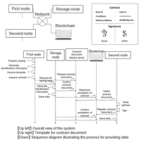 The smart contract is one of applications of the blockchain technology which realizes transaction of confidential data. The smart contract enables a seller directly to make a contract with a buyer. And when a contract to provide some confidential data is established between them, the seller him/herself needs to send it to the buyer. So the buyer cannot receive the data while the seller is offline. One approach for solving the problem is as follows: The seller stores the data on some cloud storage in advance, and then permits the buyer to download it only after the completion of the contract. In this case, the seller needs to tell the buyer which storage the data is stored in. However, one cannot include any information about the storage in the contract document because it opens to the public via the blockchain. The information processing system we have invented enables buyer safely and automatically to receive confidential data even when seller is offline. Let us consider a situation that a seller has some confidential data and that a buyer makes a contract with the seller to get the data. In the situation, the system works as follows: First node (the seller) stores the data in Storage node. Then Second node (the buyer) write, in the contract document, an address to receive the data. The document including the address opens to the public, but no information about the storage where the data is stored does. When the contract is completed, the data is sent to the address by Storage node, and Second node can finally get it.
