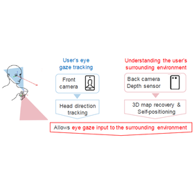 This invention is related to the eye gaze detection and eye gaze input device. In conventional eye gaze detection and eye gaze input device, the device needs to be installed in the environment or mounted on a wearable device. However, those devices have certain limitation, such as the position range where the function can be used for the former, while the latter requires the user to wear the device. This invention uses only a smartphone, and it is possible to run the function of eye gaze detection and eye gaze input with 6 degrees of freedom regardless of the user's standing position or the environment area if the user holds the smartphone naturally [1]. In detail, the system estimates where the user is looking in the environment by combining the user's gaze direction detection using the smartphone's front camera and self-position estimation using the back camera/depth sensor and 3D map of the environment (acquired in advance).
