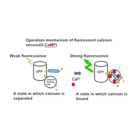 The inventors have previously developed G-CaMP and R-CaMP (CaMP) as proteinaceous fluorescent calcium sensors. By introducing CaMP into a cell, the location of the cell can be identified and changes in calcium ion concentration can be observed as changes in CaMP fluorescence intensity. ・G-CaMP7, G-CaMP7.09: Displays green fluorescence. ・R-CaMP1.07: Displays red fluorescence and can be used in combination with the photo-stimulation probe Channelrhodopsin-2, which is commonly used for cell function manipulation.