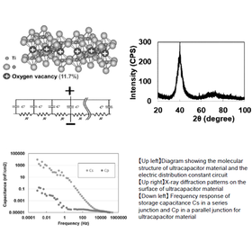 In recent years, with the rapid development of high-performance IT products and electric vehicle batteries, the demand for small capacitors with high capacity having high function such as memory is increasing. Solid, non-toxic and inexpensive materials are required for such capacitors. However, solid-state electric double layer capacitors are not yet in use. In addition, amorphous titania and amorphous fluorine polymers with nano sized irregularities on their surfaces have been developed to create quantum size effect-based energy storage materials. However, amorphous titania-based energy storage materials have low electricity storage capacity. This invention is able to provide ultracapacitor materials and ultracapacitors capable to store a larger quantity of electricity using amorphous titania. This invention includes Ti and a valve metal and has a plurality of irregularities on its surface comprising an amorphous ultracapacitor material composed mainly of TiO6.