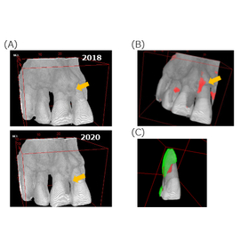 Periodontitis, which causes resorption of alveolar bone, affects most adults and causes tooth loss as it progresses. In recent years, dental Cone Beam CT has become popular, enabling three-dimensional confirmation of the morphology of alveolar bone. However, in most cases, only visual qualitative morphological evaluation was performed, and there was no method to detect minute morphological changes over time or to quantitatively analyze the amount of changes. The present invention makes it possible to visualize and quantify changes in the surrounding bone morphology by performing precise alignment using morphological information of only the root portion of any tooth. FIG. A shows alveolar bone CT images of the same patient taken at different times, but it is difficult to confirm at a glance the exact area where bone was absorbed (yellow arrow) and the amount of bone resorption over a period of two years. By performing a semi-automatic analysis of about 10 seconds using the program of this invention, it is possible to display the resorbed bone in red (FIG. B) and calculate the amount of bone resorption by volume. As shown in FIG. C, it is also possible to color the root surface of the tooth to discriminate the areas where bone is still covered (green) and where bone is lost due to resorption (red).
