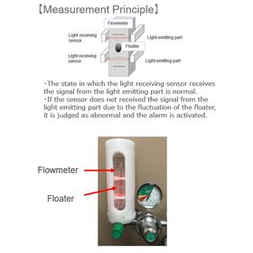 Oxygen flowmeters are widely used in medical settings, including respiratory therapy, and in life-support devices such as heart-lung machines for serious cases. Currently, medical professionals monitor the flow rate every few hours. When it is used for a heart-lung machine for a child, it is necessary to adjust the flow rate in small amounts every few weeks, and if the flow rate stops, the result will be fatal every minute. The monitoring device developed in this study can monitor the flow rate change from the outside by visual display, auditory display or both display without touching the inside of the flowmeter. [Practicality] ・Notice that the cylinder is empty The device constantly monitors that the floater is within lower to upper limit of the flow rate, and instantly notifies you when the cylinder is empty as well as when the flow rate changes. ・Malfunction prevention By setting two pairs of light-emitting part and light receiving sensors up and down, it can be seen which sensor caught the floater first, so it can be seen whether the floater came from above or below. If it is judged that the floater deviated from the monitoring measurement range, an alarm is activated.