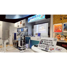 A collaborative robot that can operate without safety barriers. It is an industrial robot system manufactured by Kawasaki Heavy Industries that forms cardboard and performs packing.