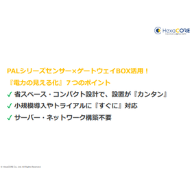 This document introduces the utilization methods of the PAL series sensors and Gateway BOX provided by Hexacore Corporation, as well as seven key points about "visualizing electricity." In addition to being able to respond "immediately" to small-scale implementations and trials, it also mentions that there is no need for server or network construction. Additionally, it features a lineup of main products such as the "Gateway BOX," "PAL-Plus type E," and "PAL-Plus." We encourage you to read it. [Contents] ■ Points of the Gateway BOX that allows for "immediate" and "easy" visualization and monitoring of measurement data ■ Points of the PAL series sensors that can measure AC current and simple accumulated electric power ■ Main products and company overview *For more details, please download the PDF or feel free to contact us.