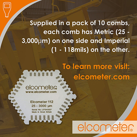 Elcometer 112AL アルミ製ウェットフィルム膜厚計は、塗装現場での「濡れ膜厚」を素早く、確実に確認できるシンプル構造の測定ツールです。塗布直後の塗膜に本体を軽く当て、どの歯が塗料に触れたかを見るだけで膜厚値を即座に判断できます。複数のスケールを備えており、薄膜から比較的厚い塗膜まで幅広い塗装仕様に対応。精密に打ち抜かれた表示孔と明瞭な目盛りにより、読み取りも容易です。また、消耗品として導入しやすいコストパフォーマンスの高さも特長で、品質管理の標準ツールとして多くの現場で採用されています。