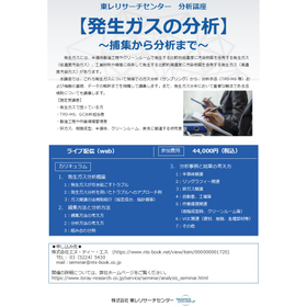 本講座では、これら発生ガスについて現場でのガス分析(サンプリング)から、分析手法(TPD-MS 等)および機器の基礎、データの解釈までを網羅して講義します。また、発生ガス分析において重要な観点である法規制についても講義します。