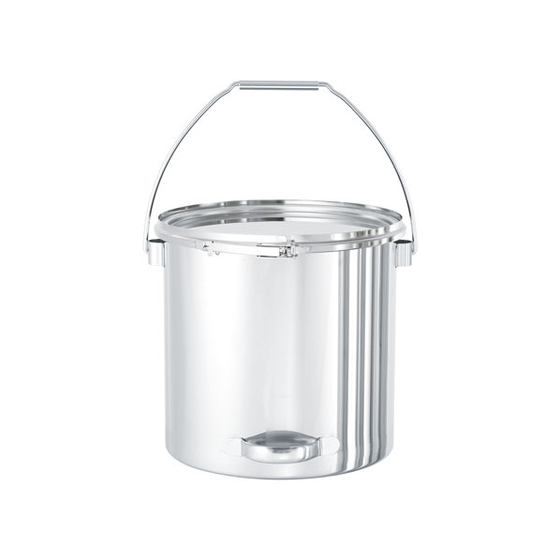 水や原料等を流しやすいよう、下部に取っ手を付けたステンレス容器 レバーバンドで簡単に密閉できます