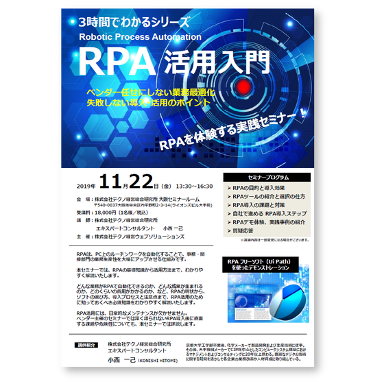 株式会社テクノ経営ウェブソリューションズは、経営者・幹部向けセミナーを 全国各地で開催しております。 RPAの基礎知識から活用方法まで、わかりやすく解説いたします。 どんな業務がRPAで自動化できるのか、どんな成果が生まれるのか、 どのくらいの費用がかかるのか、など、RPAの現状から、ソフトの選び方、 導入プロセスと注意点まで、RPA活用のために知っておくべき必須知識を わかりやすく解説いたします。 皆様のご来場心よりお待ちしております。 【開催要項】 ■日時:2019年11月22日(金)13:30~16:30 ■場所:大阪 ・株式会社テクノ経営総合研究所 大阪オフィスセミナールーム7F ■受講料:通常料金(税込)18,000円 ※詳しくはPDF資料をご覧いただくか、お気軽にお問い合わせください。