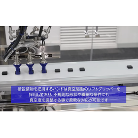 ■ 真空駆動ソフトグリッパー「piSOFTGRIP」 動画内では、被包装物を把持するハンドとして採用されております。食品や玩具等の小型で不規則な形状のピッキングに最適です。把持力は適用される真空レベルによって容易に調整・制御可能2~3本のフィンガーでワークをつかみます。 【動画】「Fuji Smart Module | パラレルロボット供給連動+FUW3401WK」 (フジキカイ社YouTube) https://youtu.be/bV1N4OkhOSQ